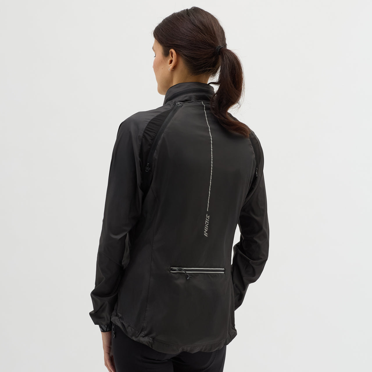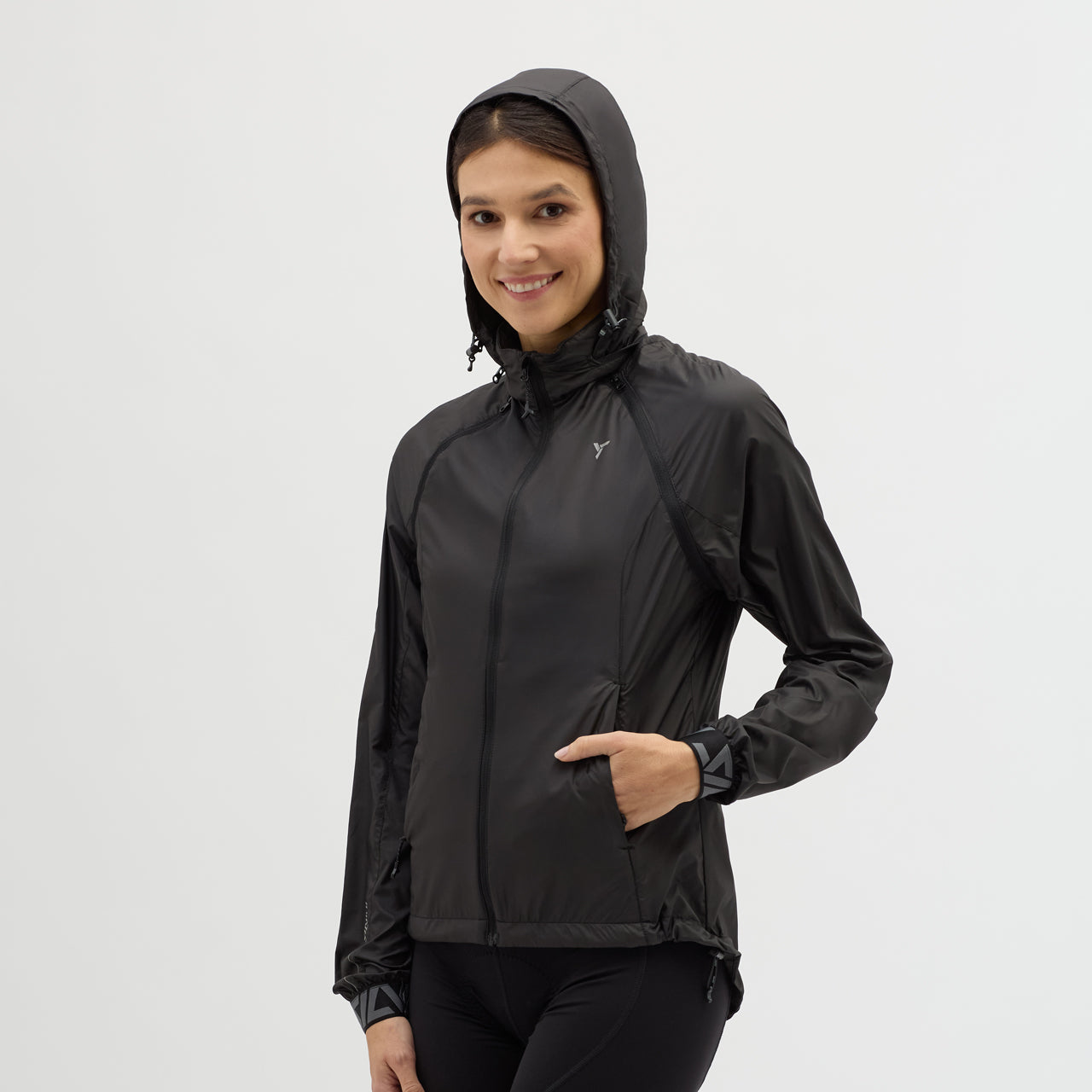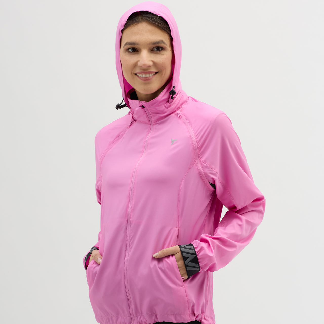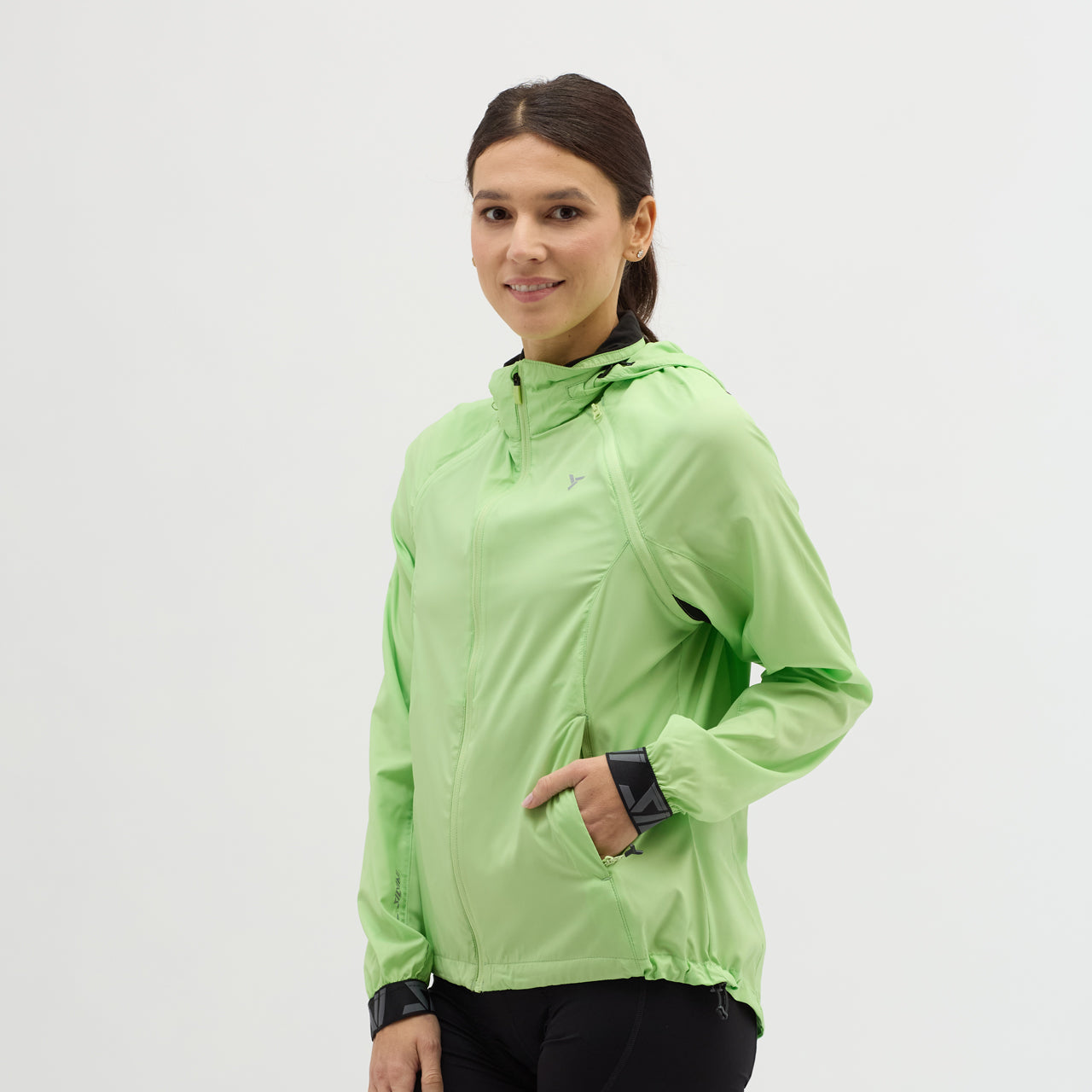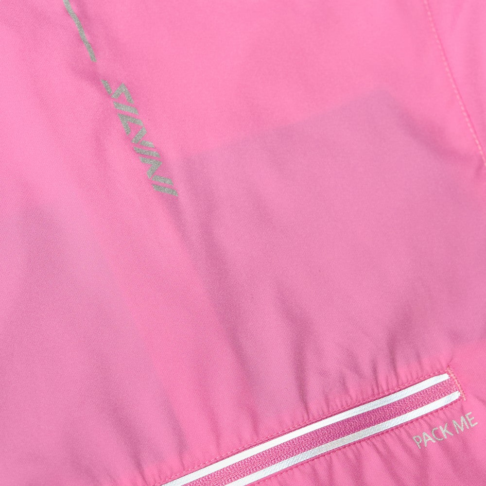 Women's windproof jacket made of Windbreaker material, packable in a small bag. By unbuttoning the sleeves, it turns into a vest, the hood can be folded into the collar. It has three zipped pockets, lower hem closure and reflexes.