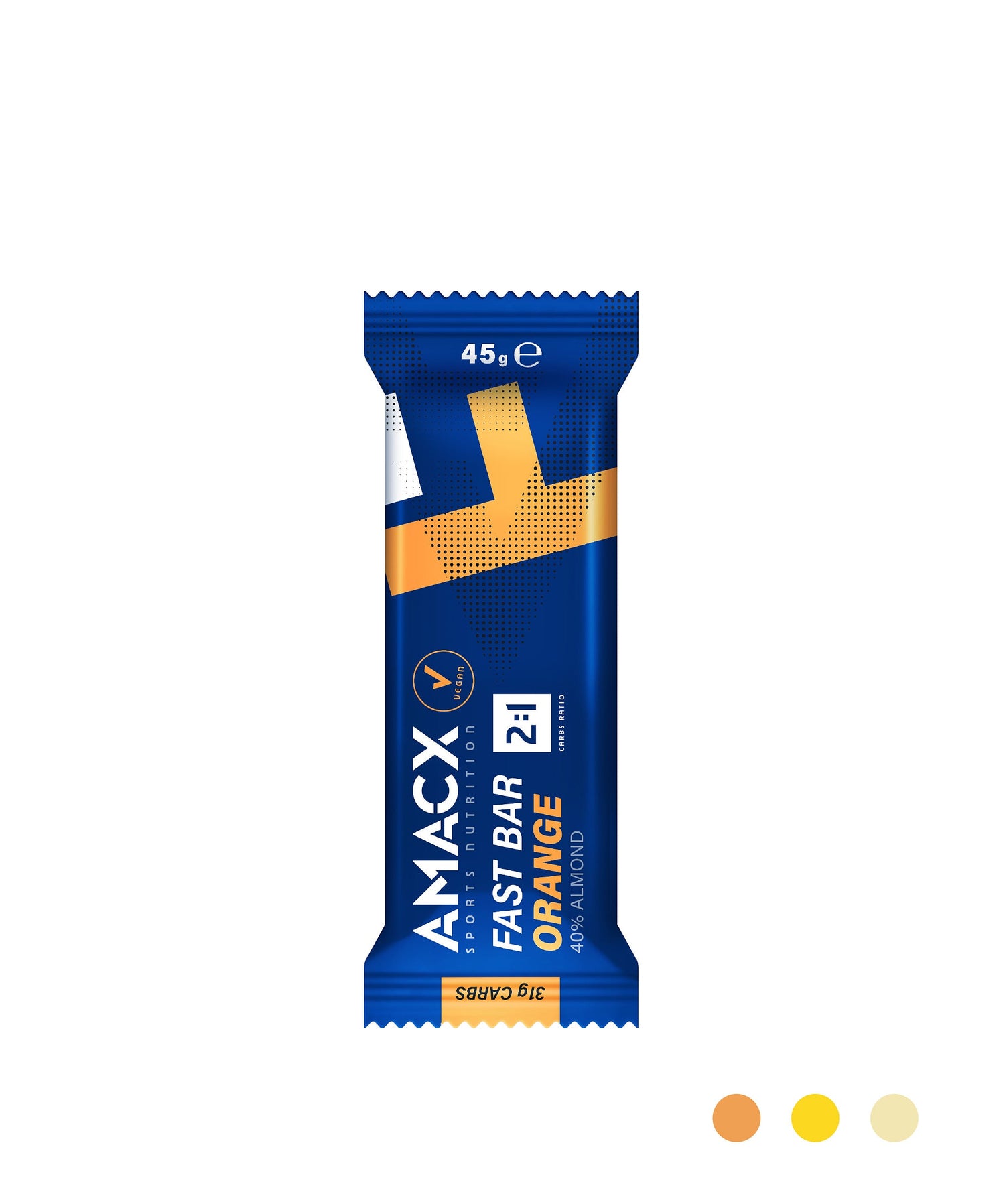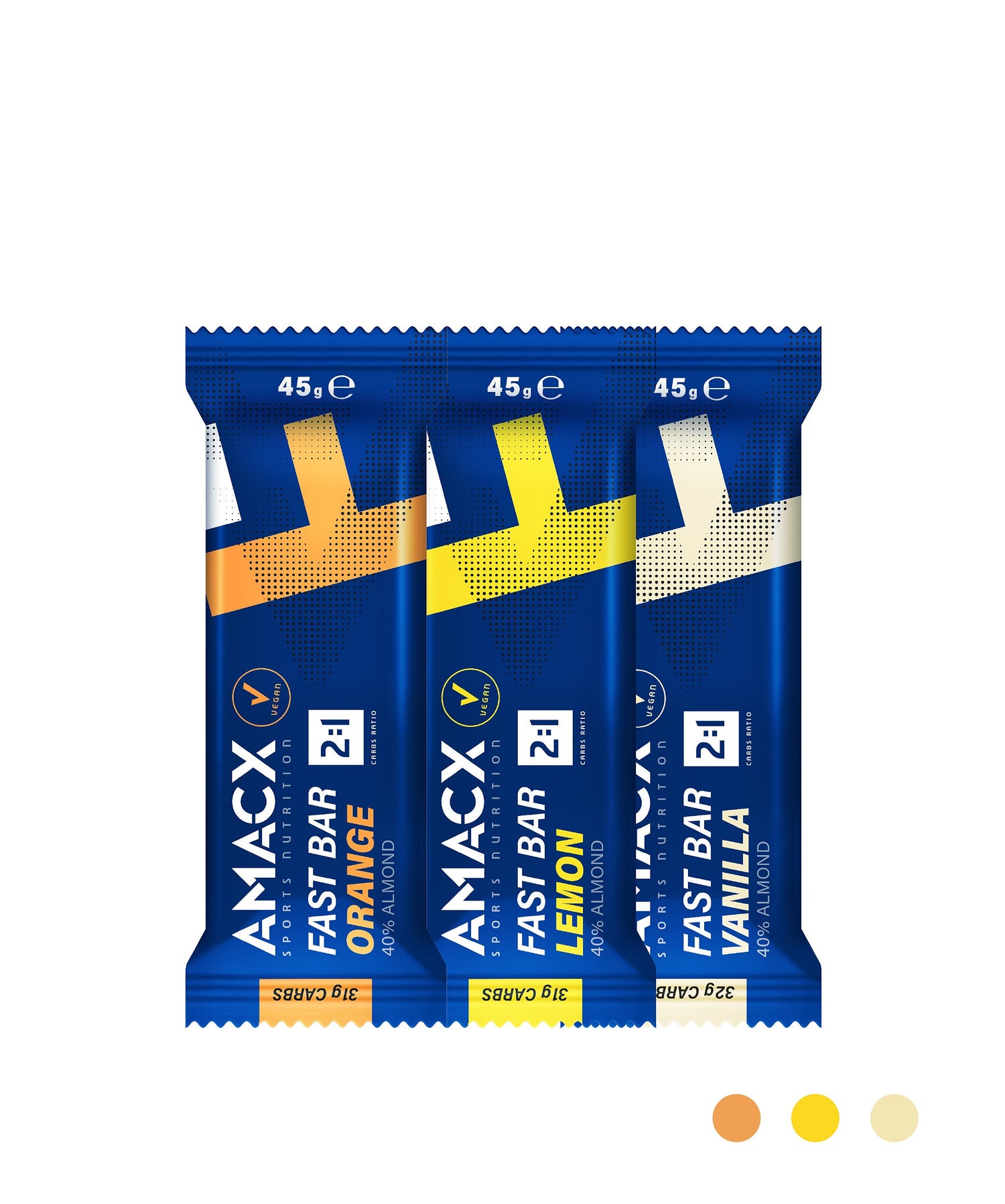 The Amacx Fast Bar is a source of various types of carbohydrates that provide the right support (2:1 carbohydrate ratio). Thanks to its soft texture, this bar is easy to consume, making it ideal for use during sports. The bar consists of 40% almonds and is naturally rich in magnesium, potassium, and calcium. Available in Lemon, Orange, and Vanilla flavours.